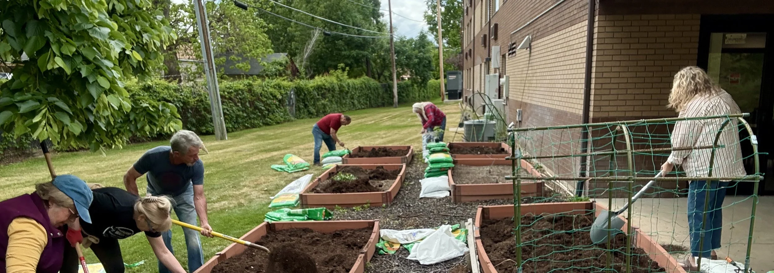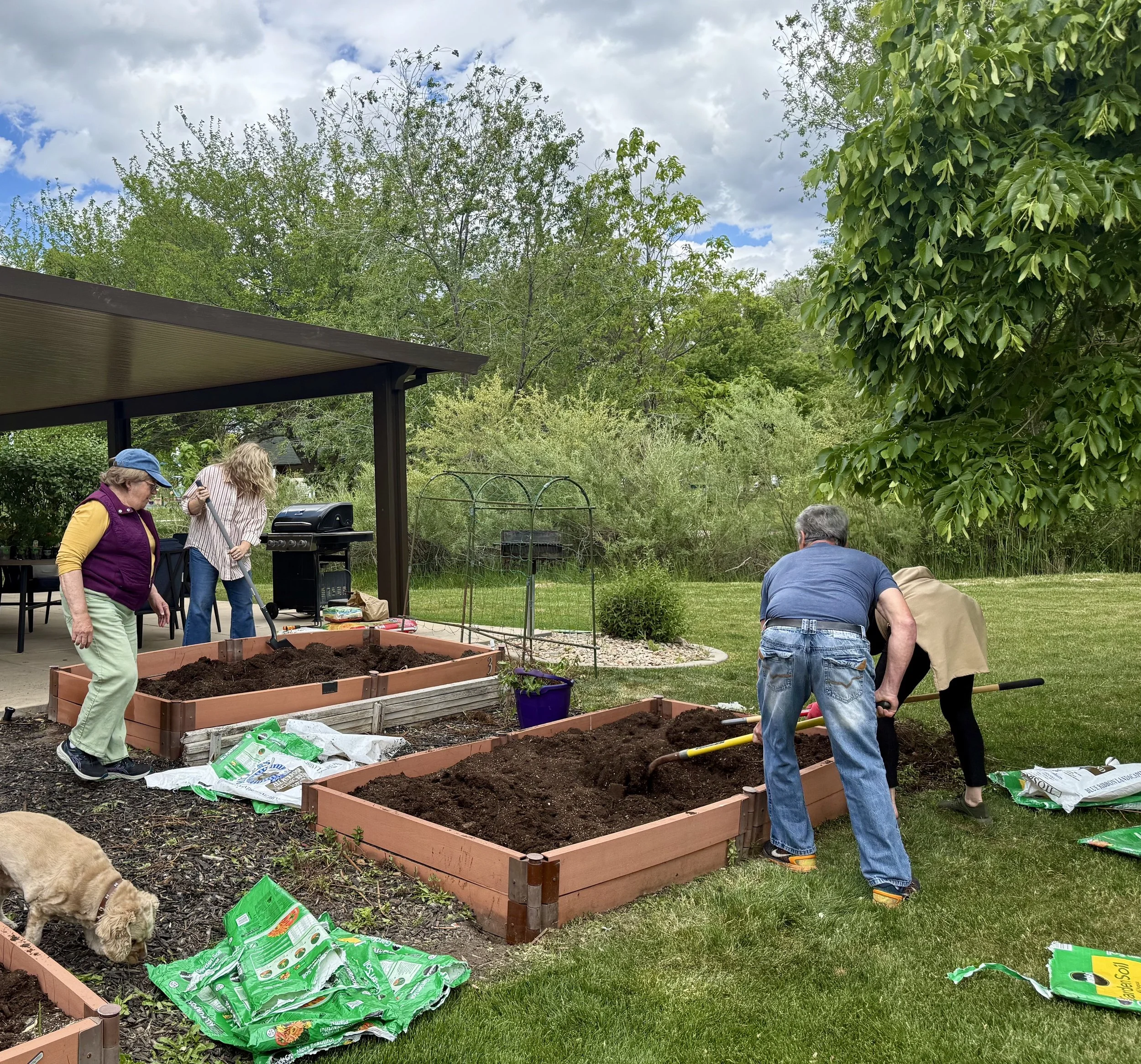 Senior living community residents and volunteers at St. Mark’s Millcreek prepare raised garden beds for planting.